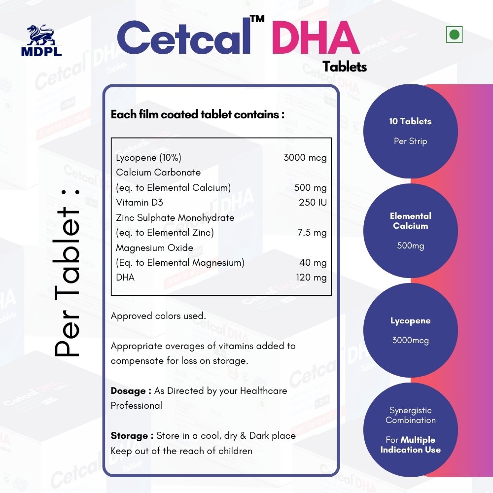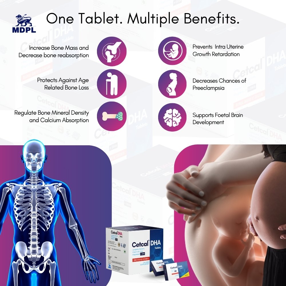 Cetcal DHA is a specialised maternal and bone health supplement combining six clinically relevant ingredients to support foetal neural development, prevent intrauterine growth restriction, maintain maternal bone density, and provide antioxidant protection — making it one of the most prescribed pregnancy nutrition supplements in India.
