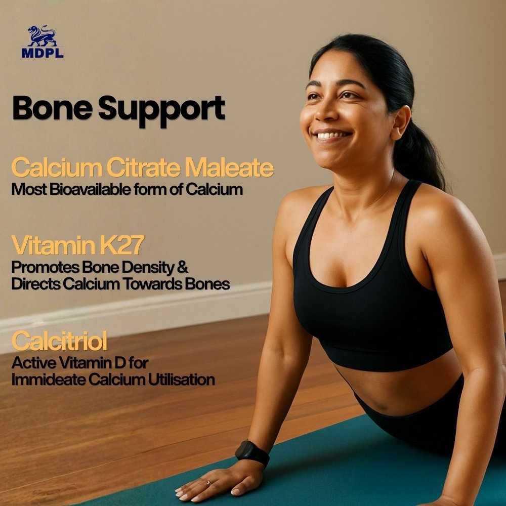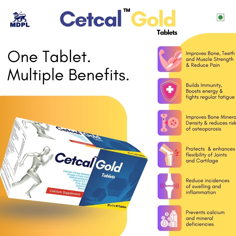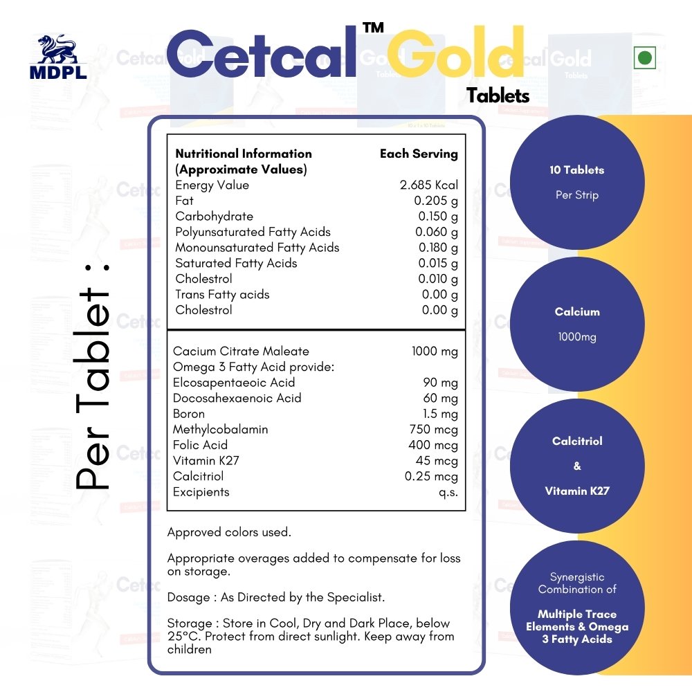 Cetcal Gold represents the premium tier of the MDPL calcium range — combining Calcium Citrate Maleate at 1000mg with Calcitriol (active Vitamin D3), Vitamin K2-7, Methylcobalamin, Omega 3, Folic Acid, and Boron in a single comprehensive tablet designed for patients requiring maximum calcium support.