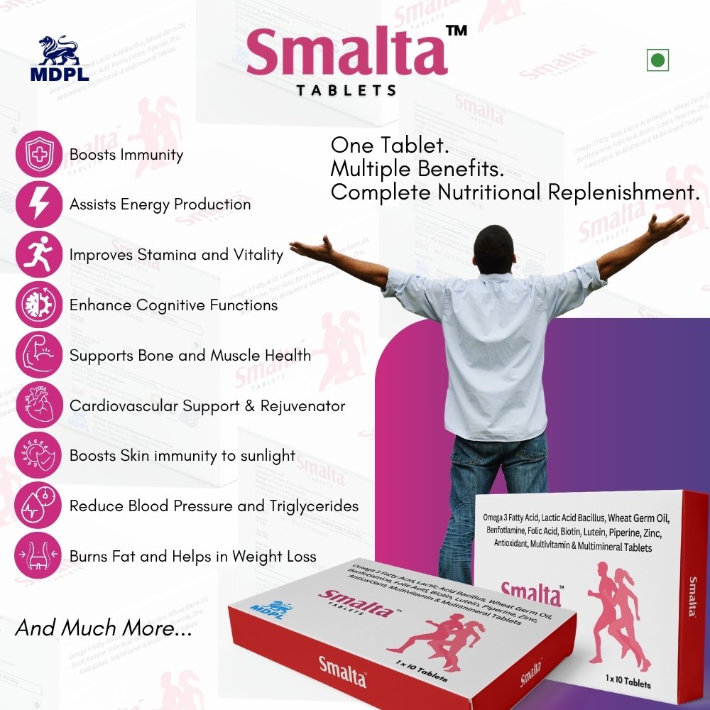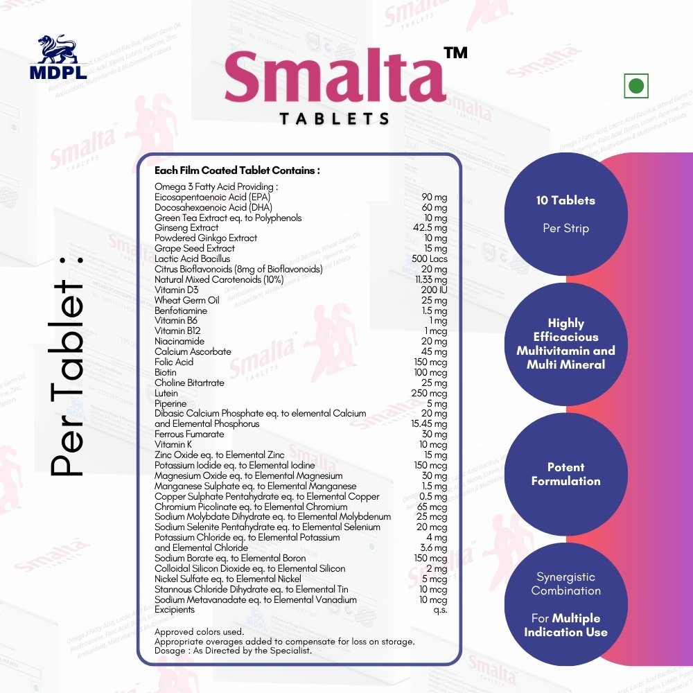 Smalta is a doctor-recommended complete multivitamin and multimineral supplement containing 37 essential nutrients — including Omega 3 EPA+DHA, Green Tea Extract 100mg, Ginseng 42.5mg, Lactic Acid Bacillus 500 Lacs, and Ferrous Fumarate 30mg. Formulated for daily immunity, energy, cardiac health, brain function, gut health, and bone support. Each strip contains 10 film-coated tablets manufactured at CGMP-certified facilities and licensed by FSSAI India.