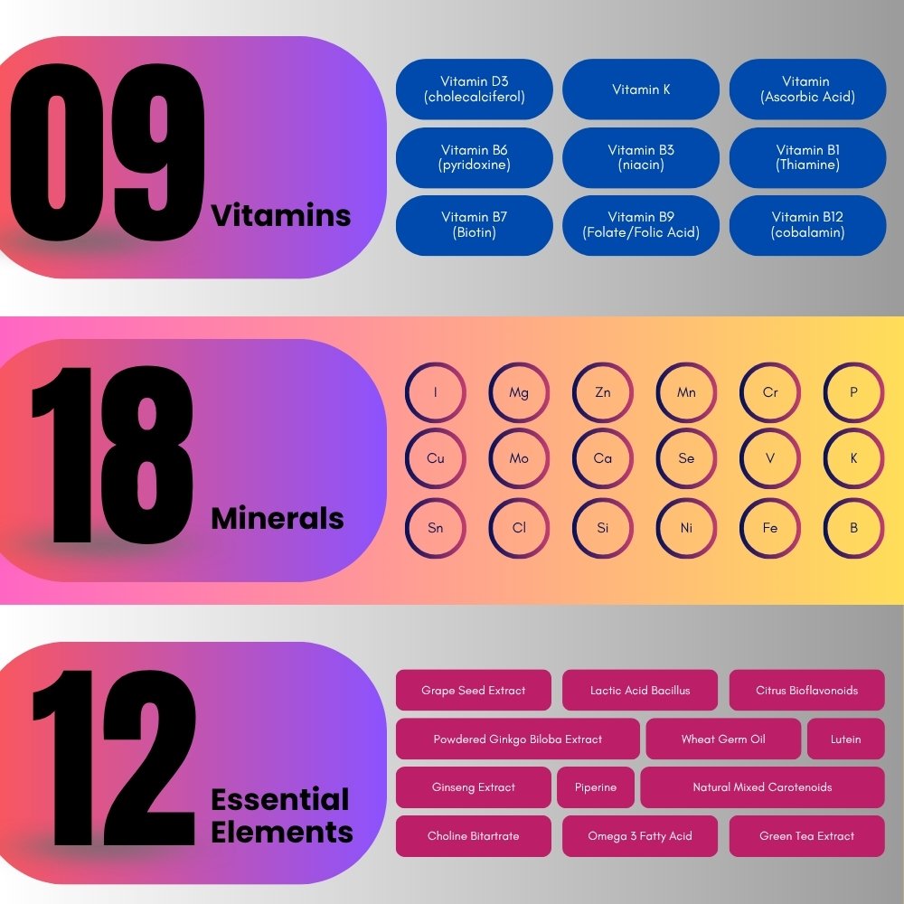 COMPLETE MINERAL MATRIX Zinc 15mg, Magnesium 30mg, Calcium 20mg, Iodine 150mcg, Manganese 1.5mg, Copper 0.5mg, Selenium 40mcg, Potassium 4mg, Boron 100mcg, Silicon 2mg, Molybdenum 25mcg, and trace minerals Nickel, Tin, and Vanadium complete the most comprehensive mineral matrix available in an Indian multivitamin.